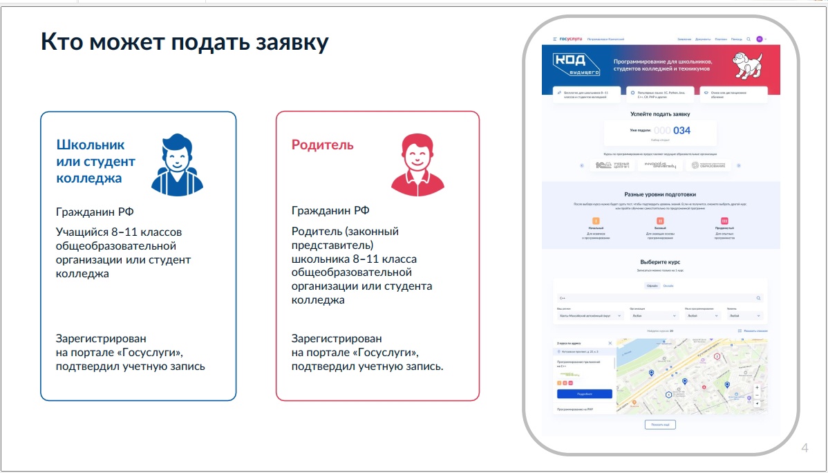В рамках федерального проекта «Развитие кадрового потенциала IT-отрасли» реализуется проект по предоставлению возможности прохождения дополнительного двухлетнего курса обучения современным языкам программирования «Код будущего».