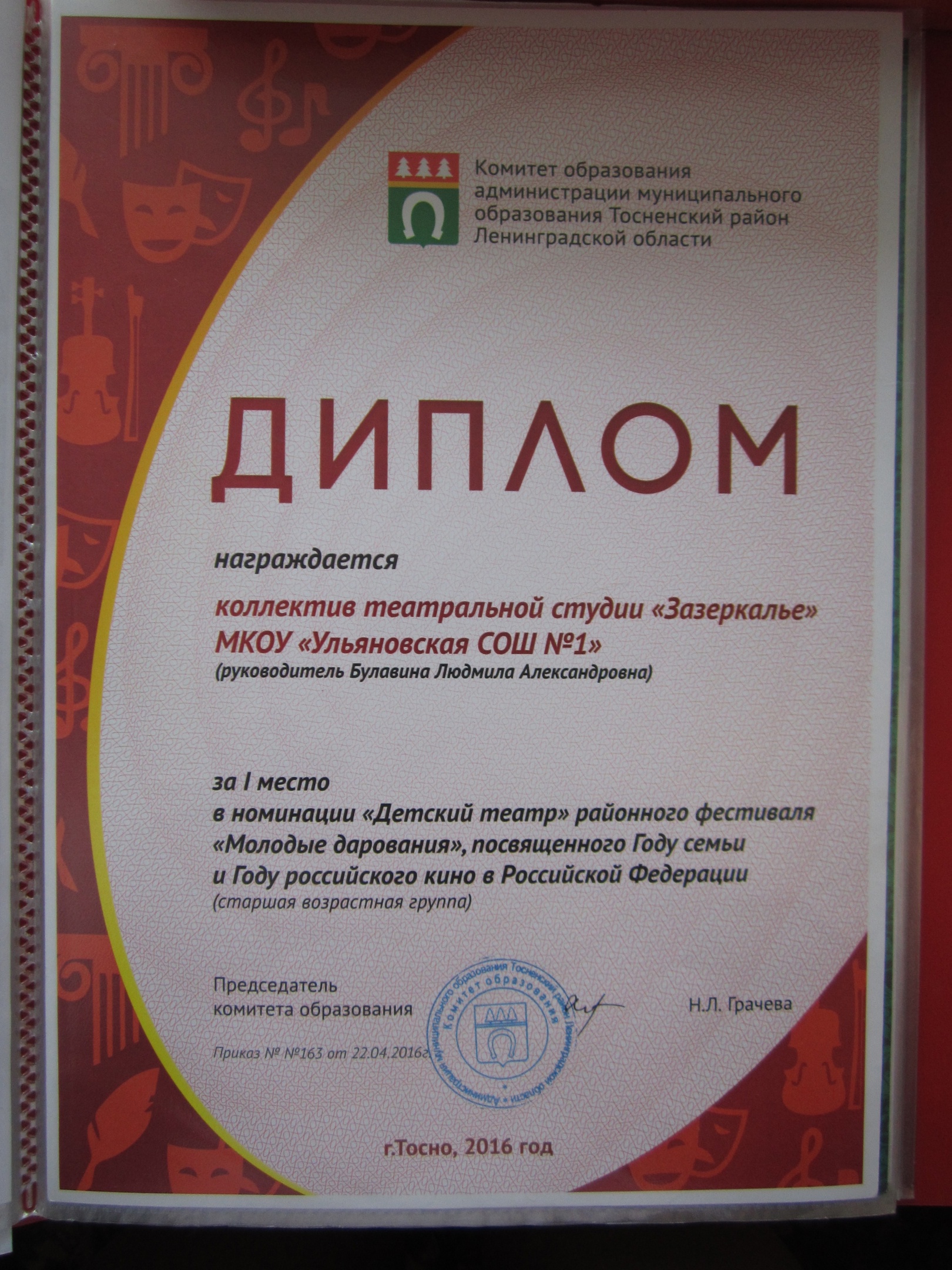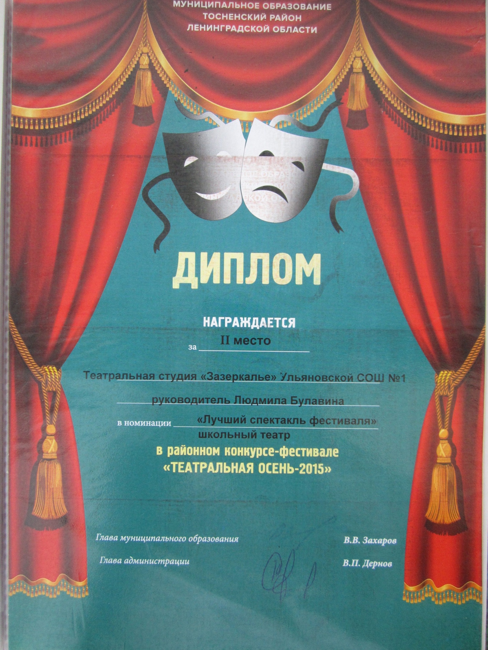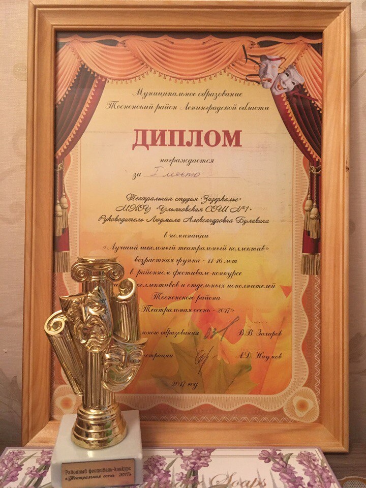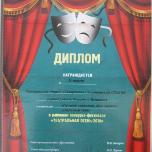 - Спектакль "Кентервильское приведение" 2015-2016 год - победитель районных конкурсов "Молодые дарования", «Театральная осень»,